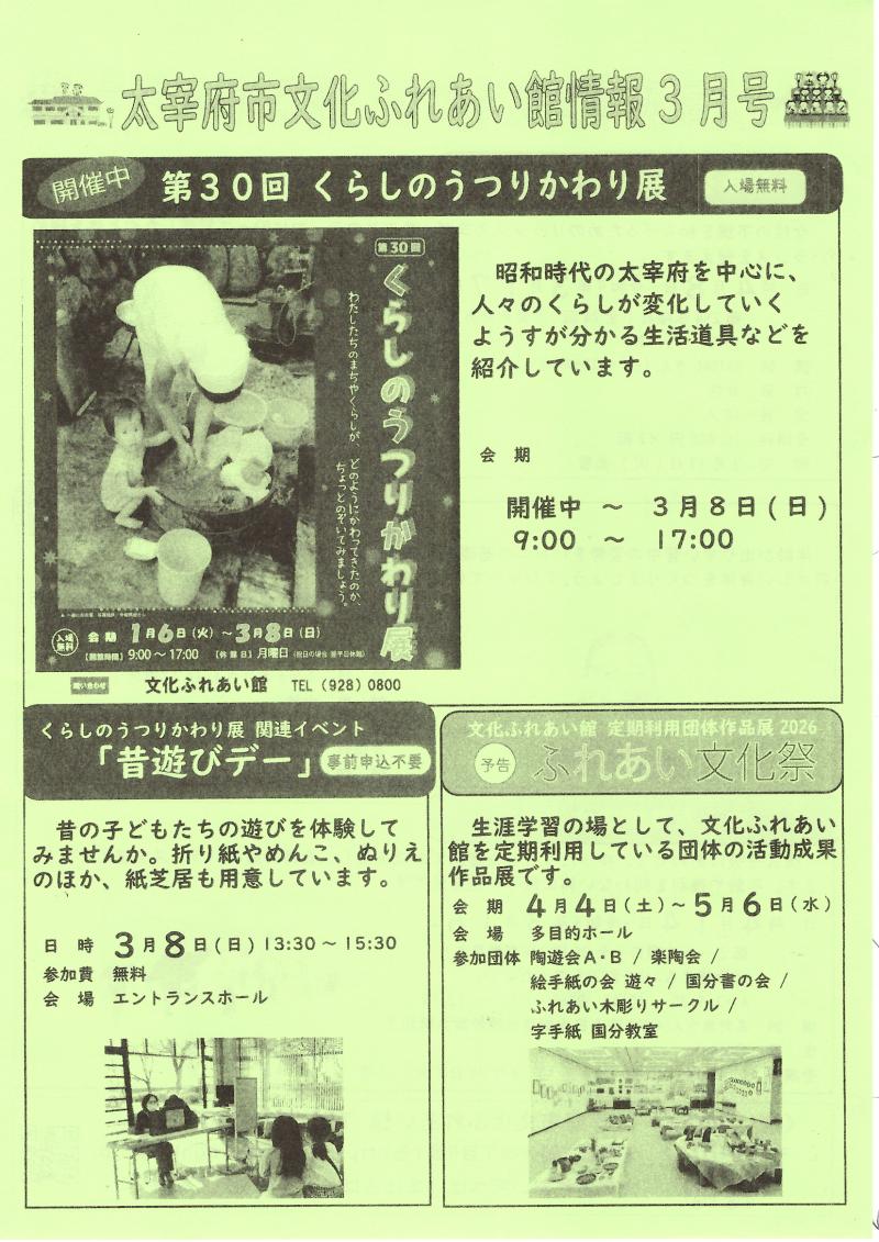 第30回 くらしのうつりかわり展会 期 1月6日(火)~3月8日(日)会 場 太宰府市文化ふれあい館 多目的展示室・多目的ホール【概 要】昭和時代の太宰府を中心に、人々の暮らしが変化していくようすが分かる生活道具などを紹介した展覧会です。昔の道具をとおして先人の知恵と工夫を学ぶことができま...