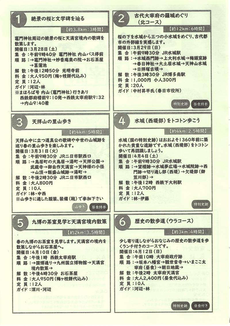 平素より、歩かんね太宰府をご愛顧いただき、まことにありがとうございます。2026年春のガイド付きまち歩きを15コース企画しました。電話・FAXに加え、ウェブサイトからも参加申込いただけますので、各コースの概要をご覧いただき、ぜひお申込みください。太宰府には多くの人には知られていないけれども、実...