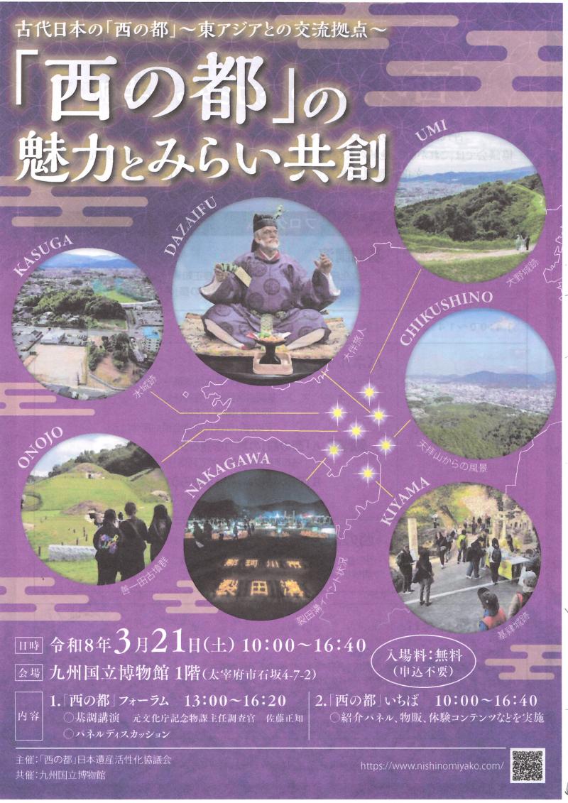 【内容】1.「西の都」フォーラム 13:00~16:20〇基調講演 元文化庁記念物課主任調査館 佐藤正和〇パネルディスカッション2.「西の都」いちば 10:00~16:40〇紹介パネル、物販、体験コンテンツなどを実施